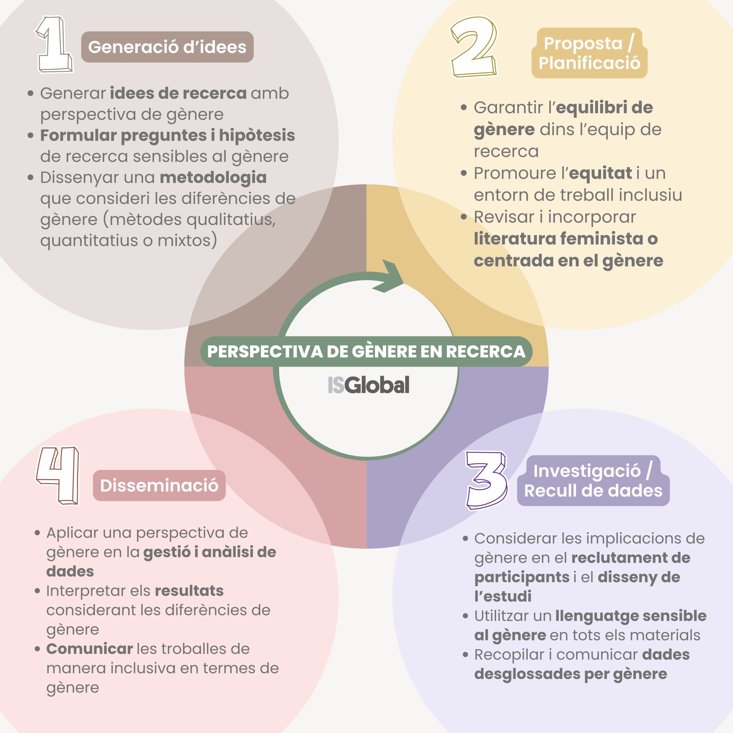 Adoptar una perspectiva de gènere en recerca, desenvolupament i innovació implica treballar per l’equitat de gènere, és a dir, garantir que totes les persones puguin desenvolupar les seves capacitats sense limitacions imposades pels rols de gènere. També suposa incorporar anàlisis que tinguin en compte tant el sexe com el gènere en totes les etapes del procés de recerca, des del plantejament d’hipòtesis fins a la comunicació de resultats, assegurant que totes les veus estiguin presents en la presa de decisions. Existeixen eines pràctiques, com llistes per identificar el biaix de gènere i guies de comunicació, que ens poden resultar útils per utilitzar un llenguatge més inclusiu.