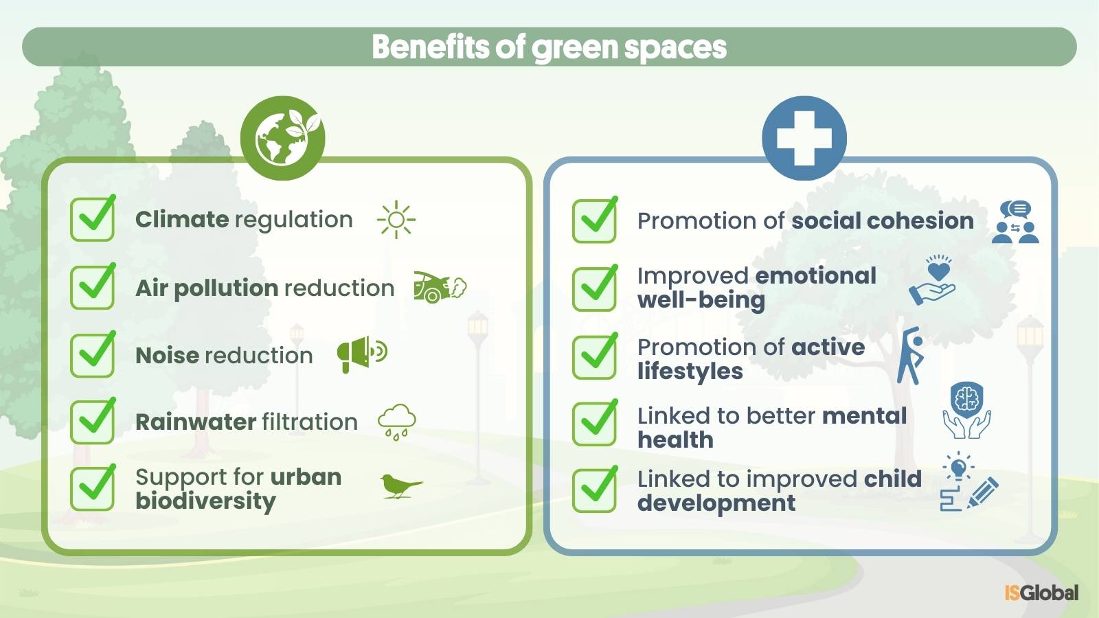 At present, more than half of the world’s population lives in urban areas, and in Spain this figure represents around 80% of the population. Urban areas often provide predominantly built environments, where exposure to nature is limited. Green spaces are beneficial both for the environment and for our health.