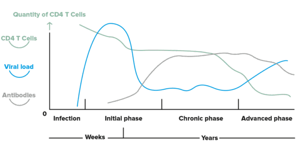 Over time, the number of functional CD4+ cells in the body decreases, leading to an immune deficiency. At the same time, the number of copies of free virus in the blood multiplies exponentially, attacking the body more aggressively. This results in the acquired immunodeficiency syndrome (AIDS) or advanced HIV disease.