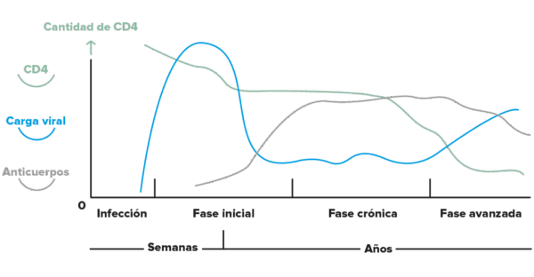 Con el paso del tiempo, se va reduciendo la cantidad de células CD4+ funcionales del organismo, dando lugar a una deficiencia inmunitaria. Al mismo tiempo, el número de copias del virus libre en sangre se multiplica exponencialmente, atacando de manera más agresiva al organismo. Esto lleva al síndrome de inmunodeficiencia adquirida (SIDA) o enfermedad avanzada por VIH.